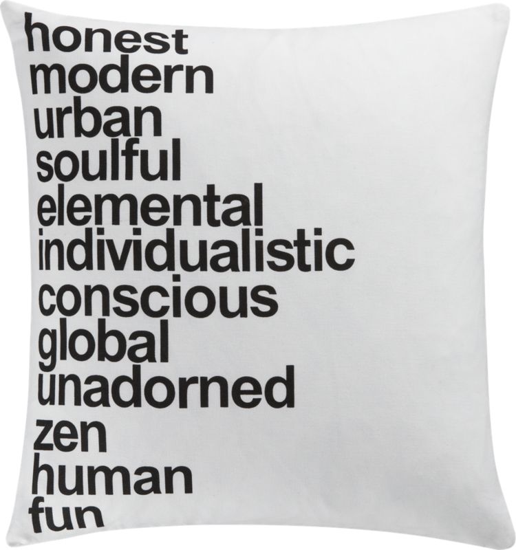 Mission statement. Plain white pouf spells out black helvetica declarations that inspire us. 100% cotton, plain back. Feather-down insert; hidden zipper closure. Machine wash. Imported.